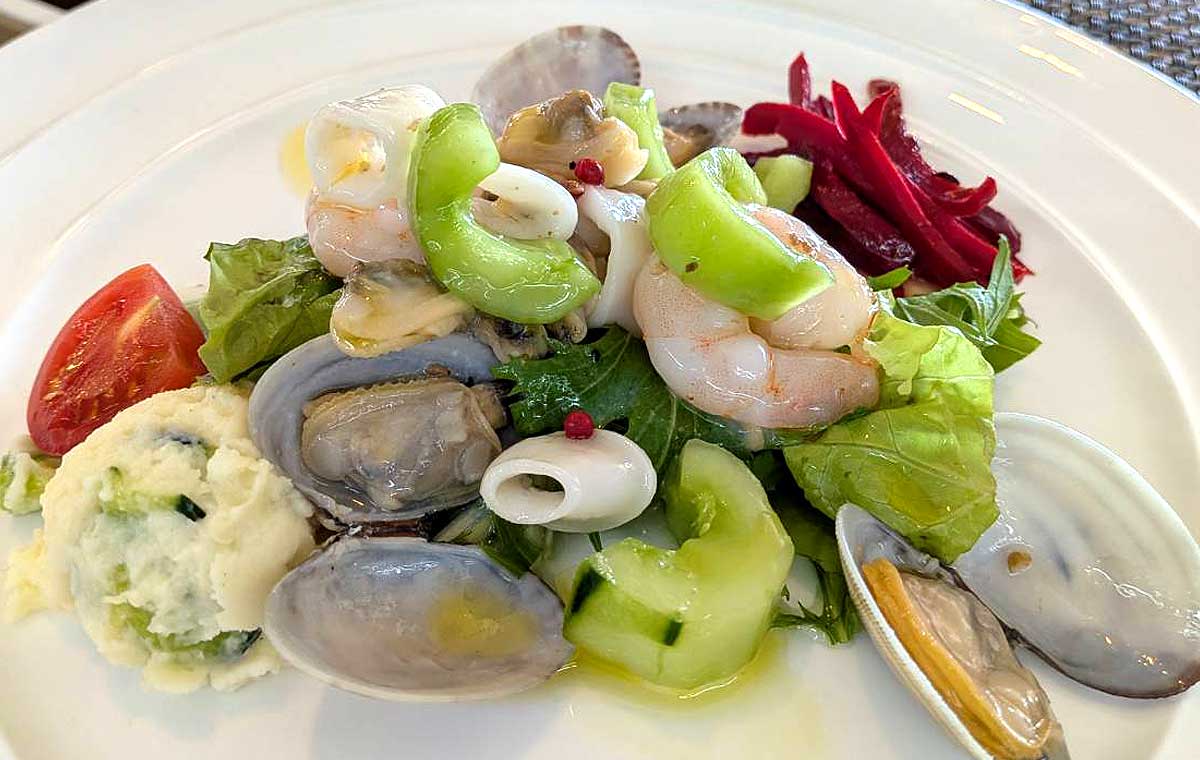 オードブル + 魚料理 + パン + デザート + ドリンク